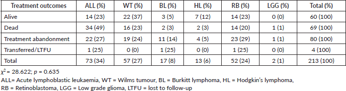 Results: A total number of 213 subjects were enrolled and ALL (n = 72;33.8%), WT (n = 57; 26.8%), RB (n = 52; 24.4%), BL (n = 17; 8.0%), HL (n = 13; 6.1%) and LGG (n = 2; 0.9%) accounted for the disease pattern. Median age at diagnosis was 5 years (51.6%). Mortality rate was 32.4% and treatment abandonment occurred in 37.6% of subjects. Treatment-related mortalities (TRMs) were 37.7% with infection and haemorrhage the commonest specific causes of TRM (36.1% and 42.5%). Only 7/95 (7%) of subjects with WT and RB stage III and IV benefited from RT. The most common reasons for non-RT were lack of funds (29%), lack of access to RT (54%) and lack of physicians’ referral (11%). Only 10 (4.3%) of subjects were enrolled in a health insurance scheme. Independent risk factor for mortality was advanced disease stage (p = <0.001). Amongst the mortalities, 36% died within the first 3 months of diagnosis.