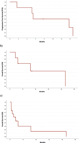 Of 9 evaluable responses (both as first line and subsequent lines) among palliative setting 5 (55.5%) were PR (Figures 3c and 4), 3 (33.3%) were SD and 1 (11.2%) progression. Median progression-free survival (PFS) with systemic therapy was 5.4 months (95% CI: 0–13.7) (Figure 5a). Median overall survival (OS) was 1.2 months (those who did not receive systemic therapy) versus 19.2 months (those who received systemic therapy) (95% CI: 0–42.2) (Figure 5b). The median OS for the entire cohort was 5.1 months (95% CI: 0.2–10.0) (Figure 5c).