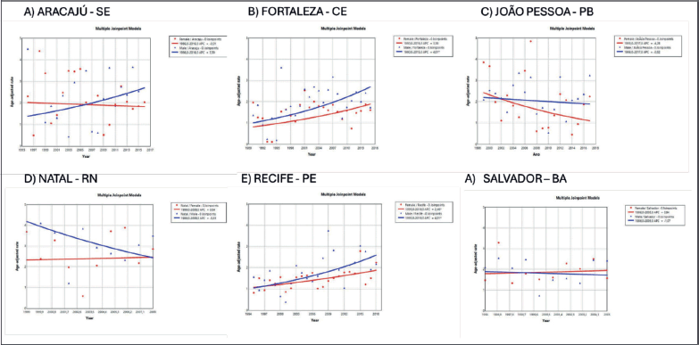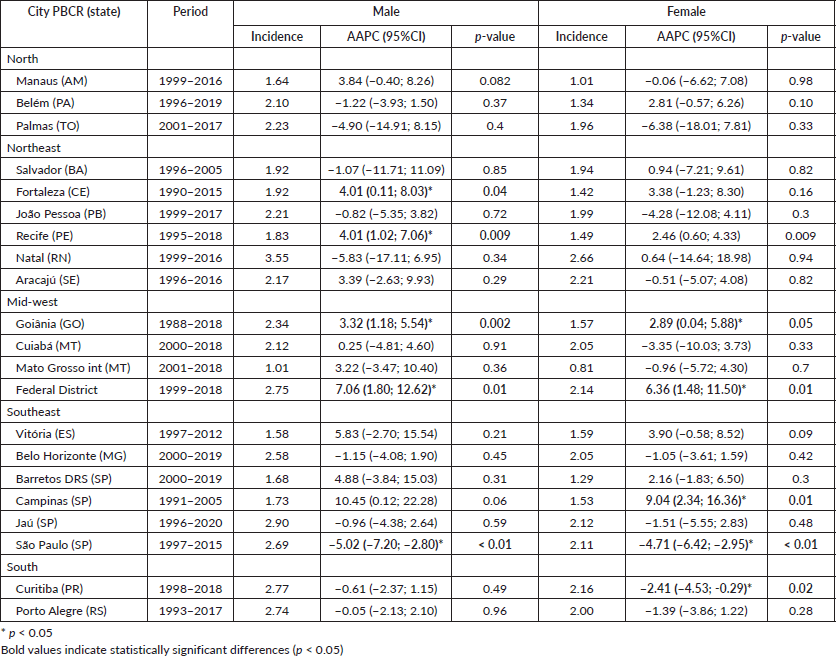 The trend in incidence, as measured by AAPC, was highest in the Federal District at 7.06% (95%CI: 1.80; 12.62) in males and 6.36% (95%CI: 1.48; 11.50) in females (Figure 4). There was a rising trend in the Northeast for males of 4.01%, but a decline in the Southeast (Table1, Figures 26).