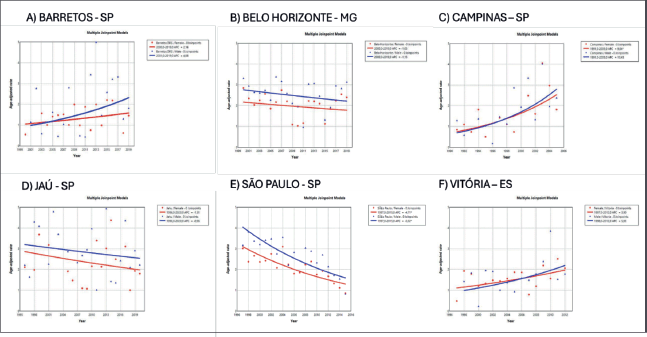 Figure 3. AAPC in the incidence of MM by sex in cities of the Southwest region of Brazil, 1988–2019. (a): Barretos – SP. (b): Belo Horizonte – MG (c): Campinas – SP. (d): Jaú – SP. (e): São Paulo – SP. (f): Vitória – ES.
