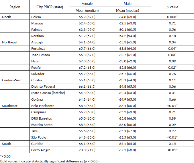 The mean age of MM patients in Brazil was 61–70 years for both genders. Regionally, the North had the lowest mean age at diagnosis (63.2 years) and the South the highest (68.0 years). Porto Alegre (RS) had the highest mean age (70.0 years in women; 67.1 in men) and Roraima the lowest (61.2 women; 54.2 men) (Figure 1/Supplementary Table 1).