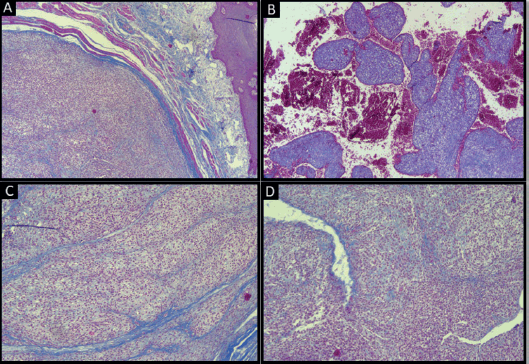 Figure 3. Masson’s trichrome-stained section of tumour showing: (a): Smooth muscle fibres (original magnification ×4); (b): Haemorrhage (original magnification ×4); (c): Collagen fibre septae (original magnification ×10); (d): Staghorn-shaped vessels (original magnification ×10).