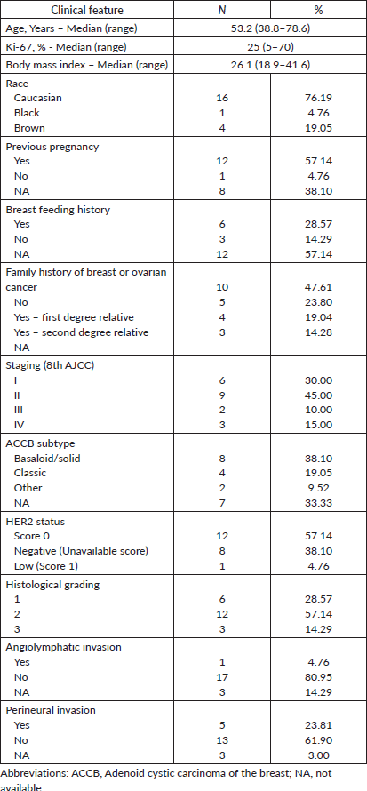 A total of 21 patients with ACCB were identified. All patients had triple-negative tumours and were female. The cohort’s median age was 53.2 (range 38.8–78.6). Most (76.9%) declared themselves white. Approximately half (47.2%) had a history of breast or ovarian cancer among first and second-degree relatives. Germline testing was not available at the institution. Basaloid (38.1%) and classic (19.0%) were the most common histologic subtypes. Regarding HER2 status, only one patient (4.7%) was HER2-low, while 12 patients (57.1%) were HER2-zero and 8 patients (38.1%) were HER2-negative without detailed immunohistochemistry results. Table 1 describes the clinical and pathological characteristics of all included patients.