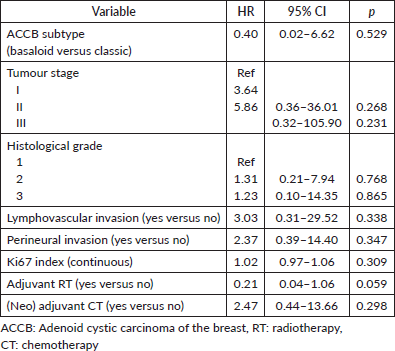 ACCB subtype, tumour stage, histological grade, lymphovascular invasion, perineural invasion, Ki67 index and (neo)adjuvant chemotherapy were not associated with RFS (Table 3).