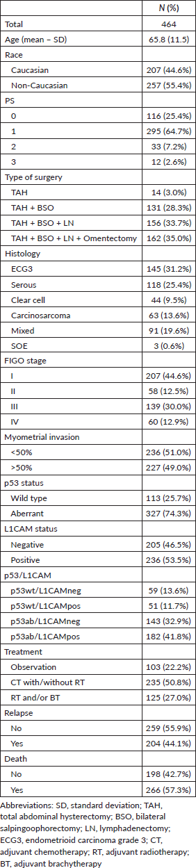 From 2010 to 2016, 2,146 patients diagnosed with EC were enrolled at INCA and 464 patients met the inclusion criteria. The mean age was 65.8 (standard deviation (SD) 11.5) years, 44% were caucasian, 90.1% had ECOG PS of 0 or 1, 31.3% underwent total abdominal hysterectomy with or without bilateral salpingoophorectomy, 31.2% had endometrioid grade 3 and 25.4% serous histology, 50.8% received adjuvant treatment with chemotherapy followed or not by radiotherapy and 27% radiotherapy and/or brachytherapy. Most patients were stage I (44.6%) or III (30%). In 29 patients, it was not possible to perform IHC on one or both markers (L1CAM or p53); 327 (74.3%) patients had an aberrant p53 pattern and 236 (53.5%) were L1CAM positive. Patients with p53 wild type and L1CAM negative (<10%, p53wt/L1CAMneg) corresponded to 13.6% (59 patients), p53 wild type and L1CAM positive (>10%, p53wt/L1CAMpos) to 11.7% (51 patients), aberrant p53 and L1CAM negative (<10%, p53ab/L1CAMneg) to 32.9% (143 patients) and aberrant p53 with L1CAM positive (>10%, p53ab/L1CAMpos) to 41.8% (182 patients). Table 1 describes the main characteristics of the population.