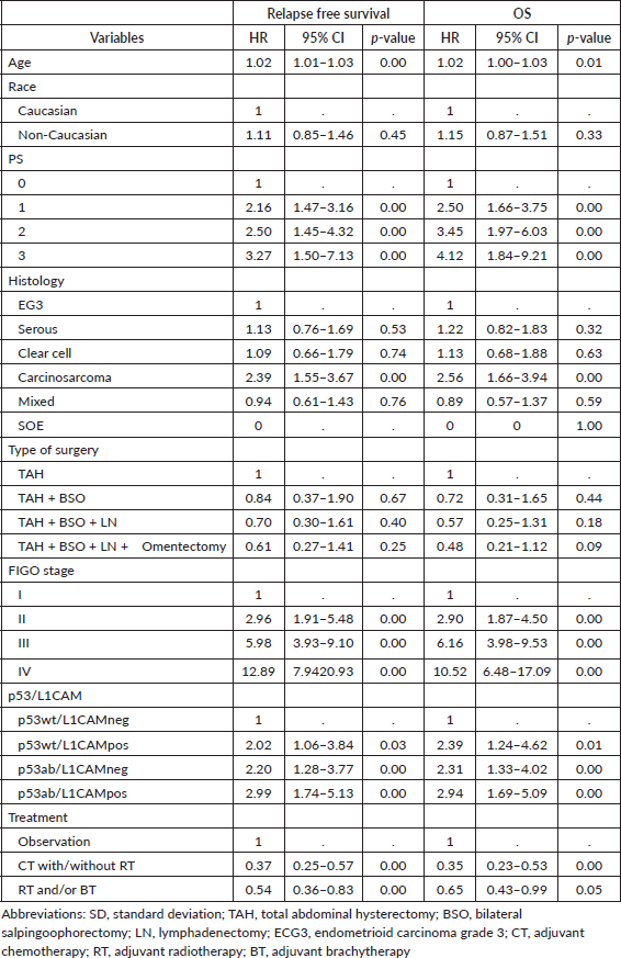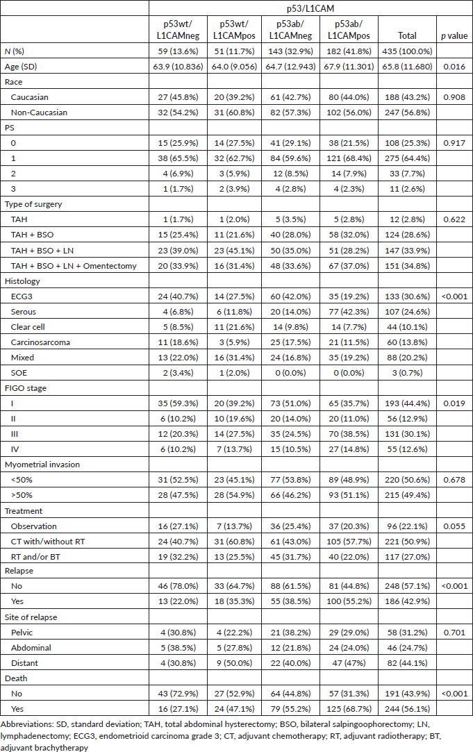Table 2. Characteristics of the study population by p53/L1CAM status.