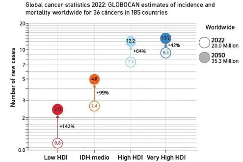 Figure 1. Comparison of new reported cases of cancer between the different groups of countries according to the Human Development Index and the estimated 2050.
