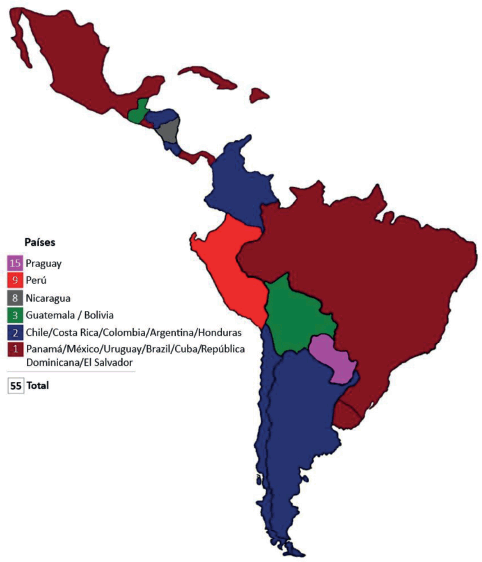 The survey was answered by 55 professionals from the 17 countries included (Figure 3). Eighty-five percent of the participants were oncologists and cardiologists, while 11% were specialists in internal medicine. Most of these specialists work in general public hospitals (63.6%).