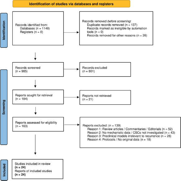This systematic review aims to critically synthesise experimental evidence on the role of CSCs in post-therapy tumour recurrence, with an emphasis on mechanistic pathways and biological processes implicated in relapse, resistance and disease progression. Specifically, the review addresses the following objectives: