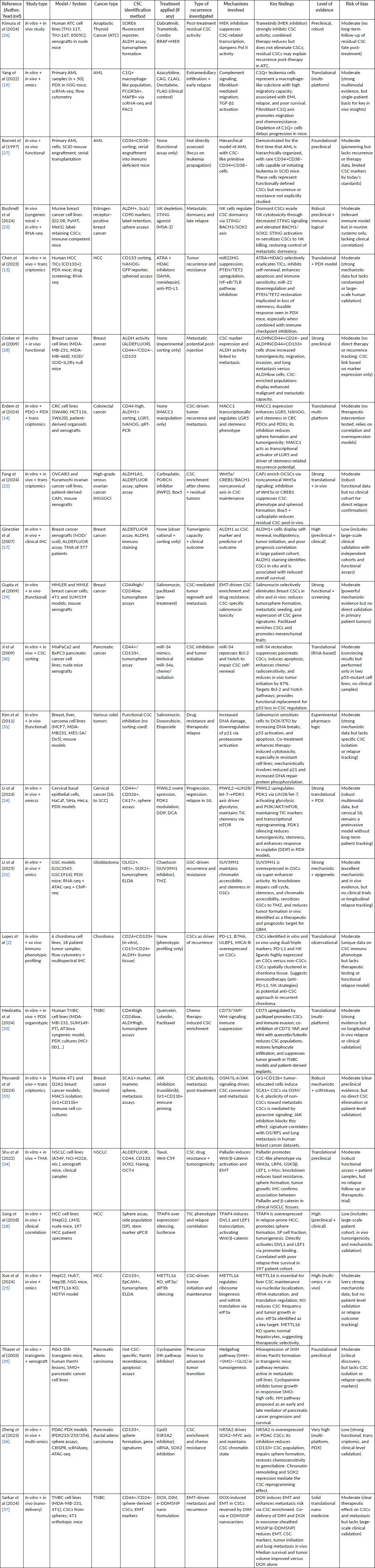 - Cancer type: All solid tumours and hematologic malignancies were considered eligible if CSCs were explicitly investigated in the context of therapeutic relapse or recurrence.
