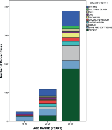 Results: There were 529 new cancer cases among AYAs, accounting for 14.1% of all cancer cases seen during the period. The male-to-female ratio was 1:3. The majority (72.8%) were in the 30–39 age range, with a mean age of 32.06 ± 6.18 years. Females had a higher mean age (33.01 ± 5.31 years) than males (29.43 ± 7.57 years) (p < 0.001). Breast (39.1%), bone and soft tissue (12.9%) and cervix (11.6%) were the most common sites of cancer in AYAs. Among the males, bone and soft tissue (20.0%), nasopharynx (13.6%) and sinonasal (10.7%) were the most common sites, while breast (52.2%), cervix (15.4%) and bone and soft tissue (10.0%) were the most common sites among females.