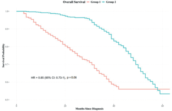 Kaplan-Meier survival analysis indicated differences in survival outcomes between Groups 2 and 1, with an HR: 0.85 (95% confidence interval: 0.73–1), p = 0.06 (Figure 2).