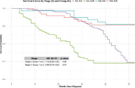 • Stages I and II: No significant differences in survival were observed between the groups (Figure 3).