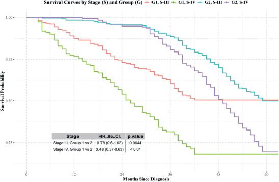 • Stages III and IV: Differences in survival were observed, with Group 2 showing better results (Figure 4).