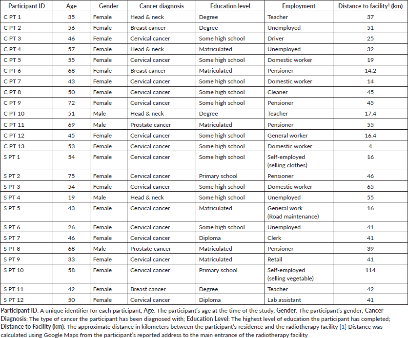 The experiences of patients undergoing radiotherapy were explored through semi-structured interviews conducted at two public oncology centres in Gauteng Province. Twenty-five patients were interviewed: 22 who were currently receiving treatment and 3 who were attending follow-up appointments. Participants ranged in age from 19 to 75 years, with a majority being female (84%). The most prevalent cancer type among participants was cervical cancer, reflecting its significant burden in this population. Most participants resided in townships and faced considerable travel distances, exceeding 30 km, to access the radiotherapy facilities.