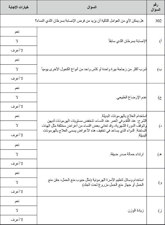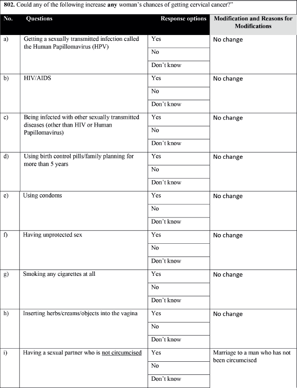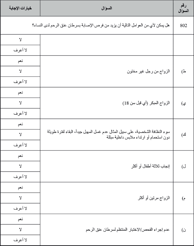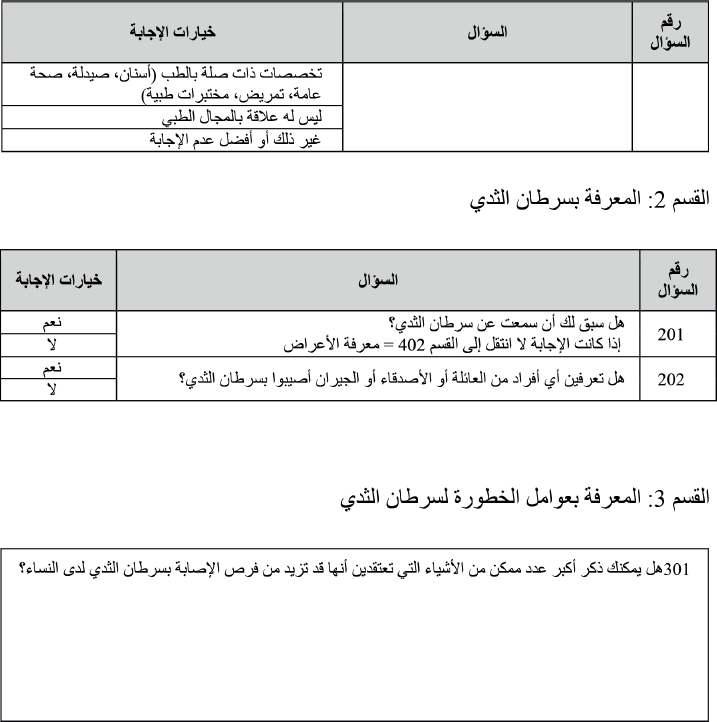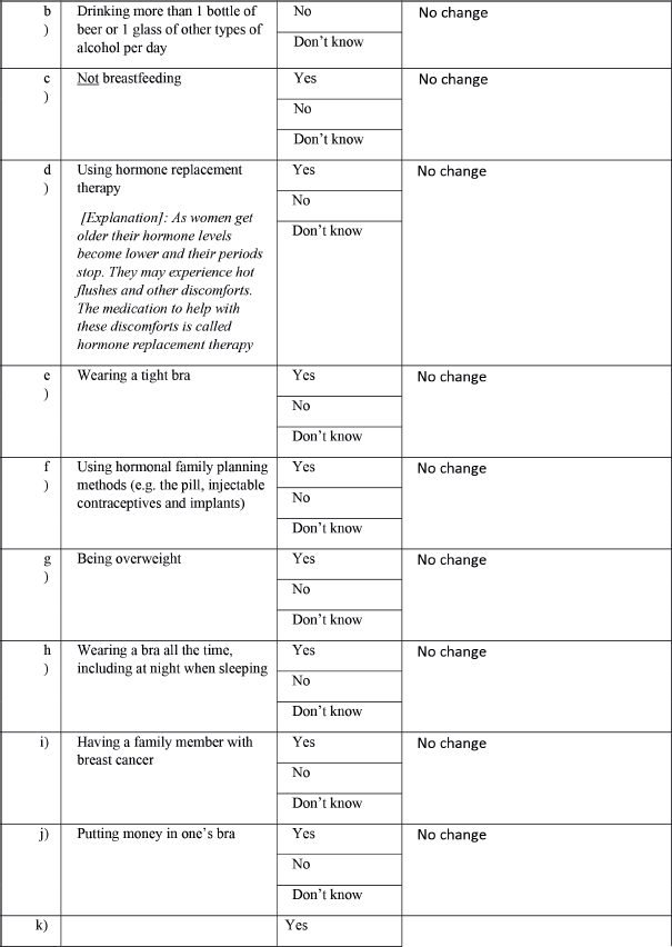 To enhance cultural sensitivity, modifications were made to the BC and CC risk factors. In the CC section, the following changes were implemented: ‘having a sexual partner who is not circumcised’ was rephrased to ‘marriage to a man who has not been circumcised,’ ‘having sex at a young age’ was revised to ‘early marriage (i.e., before the age of 18),’ and ‘having many sexual partners’ was rephrased to ‘marriage twice or more’. Questions about ‘bewitchment/witchcraft/evil spirits’ as a risk factor for both BC and CC were modified to more suitable choices for the Arabic culture.