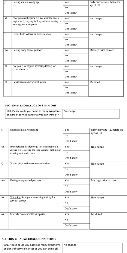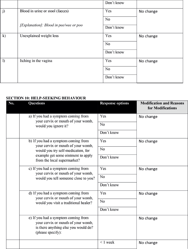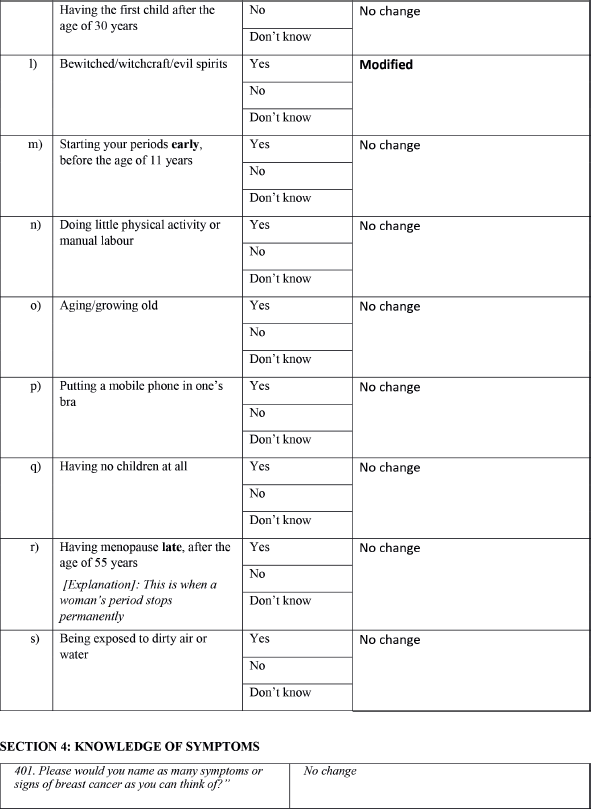 The lay beliefs items are embedded within each related section to work as distractor items; however, they are not included in the scoring. The questionnaire is designed to assess knowledge about BC and CCs collectively, but it can also be used to assess knowledge about either cancer separately. The tool is available in English, in isiXhosa (for South Africa) and Acholi (for Uganda).