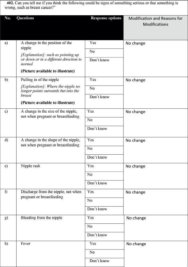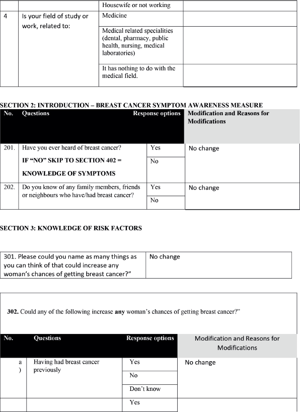 Consequently, the research team decided to remove several socio-demographic questions, modify others to be more culturally appropriate and add a new section to the questionnaire. This new section includes questions designed to assess participants' interest in receiving additional information about BC and CC, identify specific topics they wish to learn more about (e.g., risk factors, symptoms and treatment) and determine their preferred methods for receiving this information (e.g., brochures, workshops and online resources). Supplementary Material 1 provides a detailed list of original questions, modification and reasons for modifications and newly added questions.