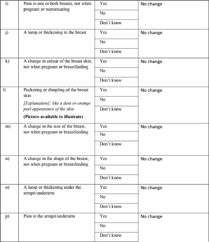 2. BC awareness: symptoms, risk factor awareness, confidence and help-seeking measures (50 questions-unchanged from the original tool).