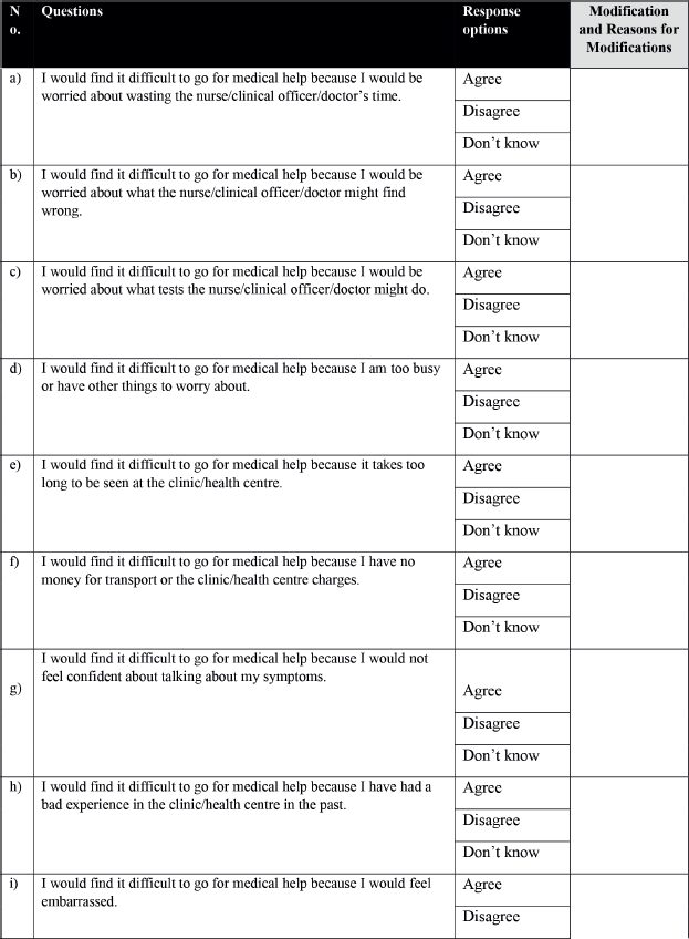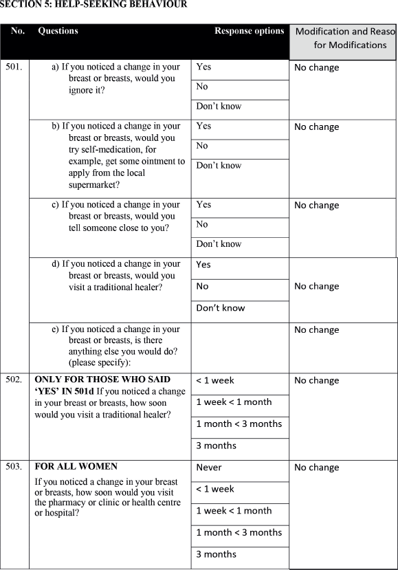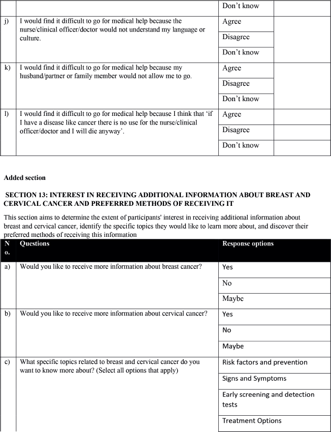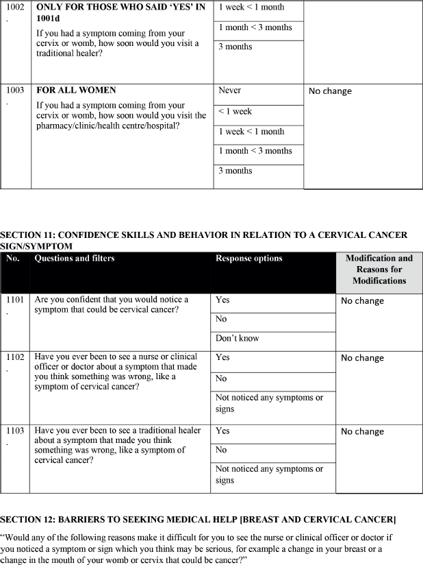 4. Barriers to seeking care for BC and CC (12 questions-unchanged from the original tool).