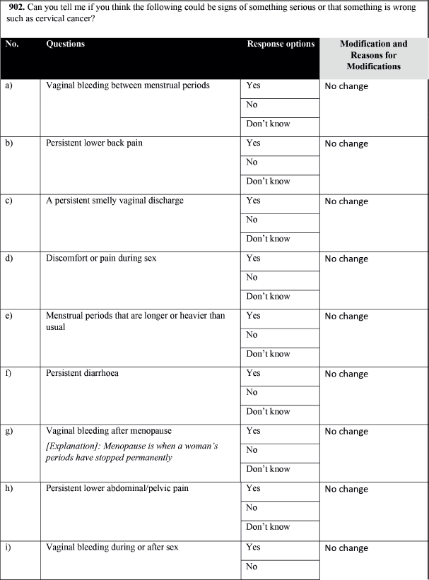 The collected feedback was analysed qualitatively by the members of the research team who identified recurring themes and issues. Discrepancies in their interpretations were resolved through discussion to reach a consensus. The feedback from the interviews revealed several key areas for improvement in the adapted cancer awareness questionnaire. Participants validated the research team's initial concerns regarding the suitability of several socio-demographic questions. Specifically, questions about the primary language used in the participant's home and whether the participant has tap water in her house, complex or property were deemed inappropriate and were therefore removed. Furthermore, participants strongly recommended rephrasing questions related to cancer risk factor beliefs, particularly those concerning supernatural or spiritual causes of cancer, to enhance both clarity and cultural relevance. For instance, the question about ‘bewitchment, witchcraft or evil spirits’ as a cause of cancer was rephrased to better suit local culture. Participants also expressed a desire for additional information regarding cancer risk factors and symptoms.