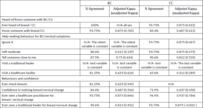 Table 2. Test-retest reliability analysis (No. 32 participants): Adjusted and Unadjusted Kappa for help-seeking behaviours and Confidence for breast and CCs.