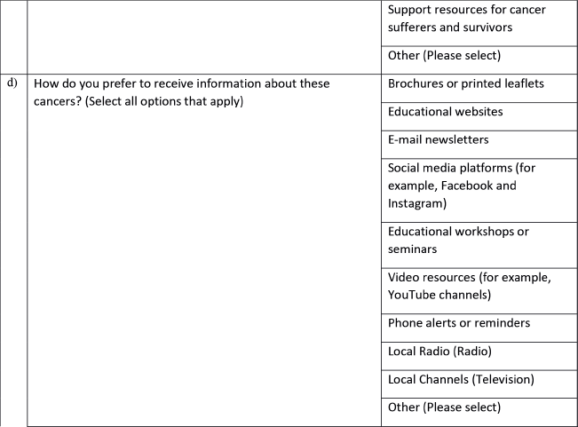 4. Participants preferred methods of receiving information about these cancers (with options to select from brochures, websites, email newsletters, social media platforms, workshops, video resources, phone alerts, local radio, local channels and others).