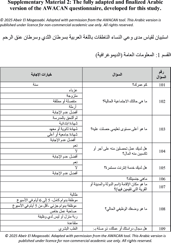 In conclusion, this study successfully adapted and validated the AWACAN tool for Arabic-speaking populations, demonstrating its reliability and validity in assessing BC and CC awareness. As the first comprehensive tool of its kind in Arabic, it serves as a valuable and culturally sensitive resource for healthcare professionals and researchers seeking to improve cancer education and prevention in these communities. The findings highlight significant knowledge gaps, particularly regarding CC, revealing the critical need for targeted educational interventions tailored to the specific cultural context.