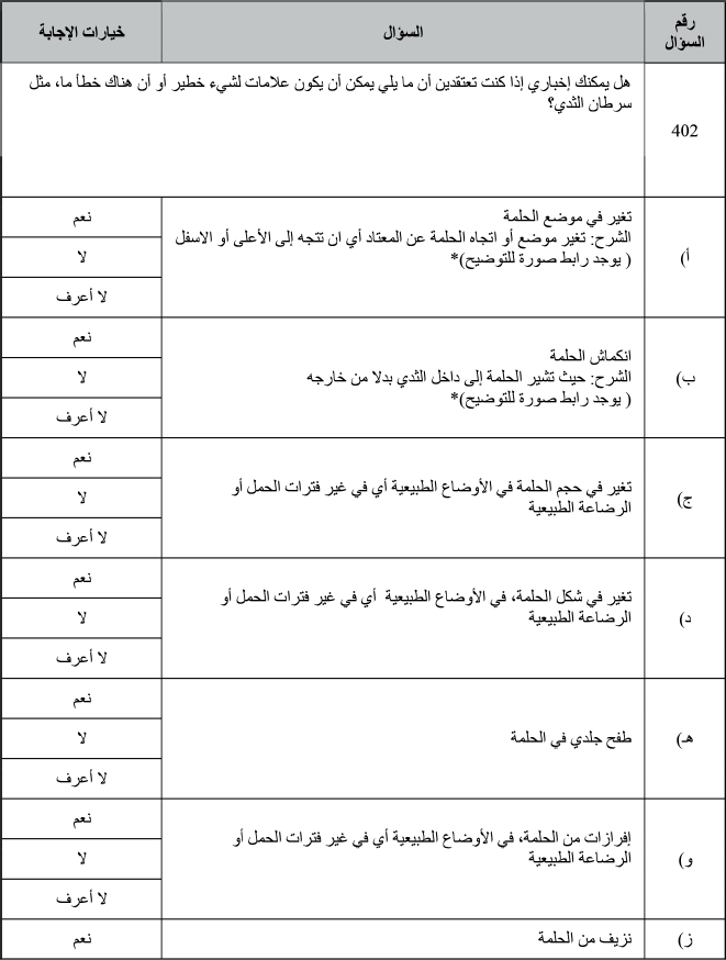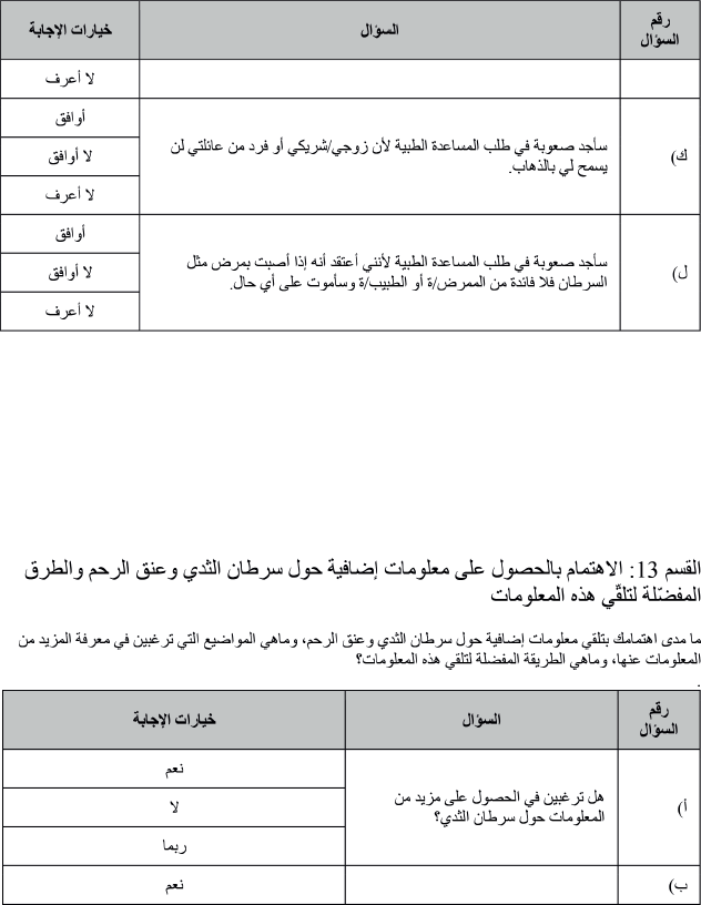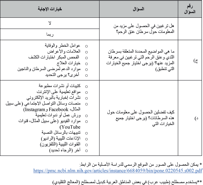 5. Information dissemination preferences: Interest in receiving additional information about BC and CC and preferred methods of receiving it (four questions - exclusive to the Arabic version).