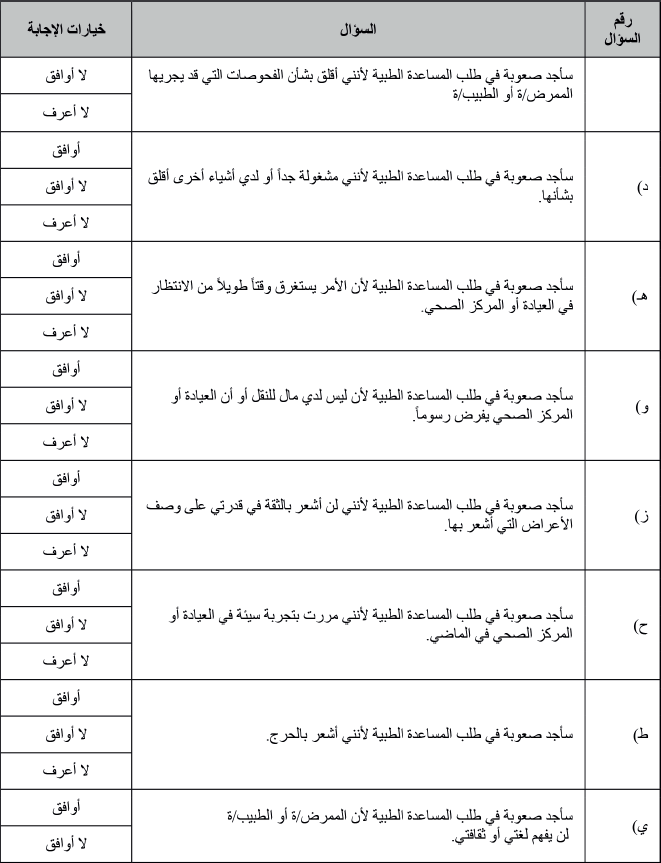 The fully adapted and finalised Arabic version of the AWACAN questionnaire, developed for this study, is included in Supplementary Material 2. The questionnaire can be self-administered online or via paper, or administered in an interview format. It includes both scored items and lay belief items (embedded as distractor items, but not scored). The maximum score of the questionnaire is 50 points, distributed as follows: