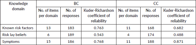 Table 6. Internal consistency reliability (KR-20) of knowledge domains for breast and CC (No. 195 participants).