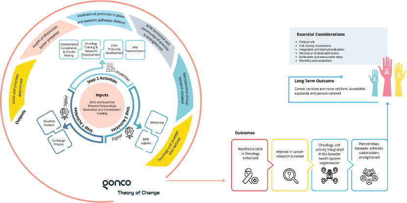 Figure 1. Theory of change of GONCO. Outlines the inputs, activities of the three steps, outputs, outcomes (intermediate and long-term) and other considerations for successful implementation. MTB, Multidisciplinary Tumour Board.