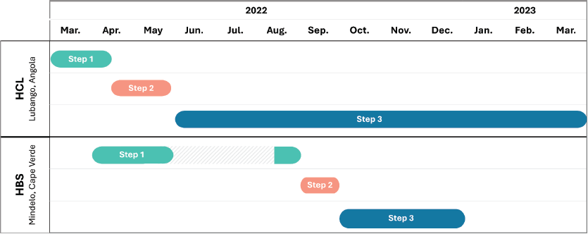 During 2022 and 2023, GONCO completed its first two pilot projects in two different locations. The first was developed at Hospital Central de Lubango (HCL) in Lubango, Huíla province of Angola and the second at Hospital Dr Baptista de Sousa (HBS) in Mindelo, São Vicente Island, of Cape Verde. In these two countries, the development of decentralised oncology units is part of the national strategy to improve cancer care, in the pursuit of overcoming major inequalities between regions. The theory of change, with GONCO’s main activities, outputs and outcomes, is presented in Figure 1, and the timeline and duration of the different steps of both projects are in Figure 2.