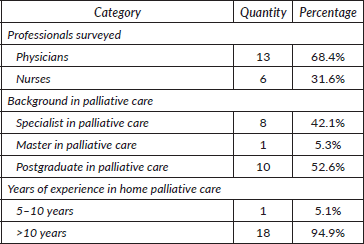 During the study to reach consensus on the NS, two Delphi rounds were conducted with 19 expert palliative care professionals from Argentina. The experts were selected based on their experience in home-based palliative care and postgraduate academic training. The panel consisted of 13 physicians and six nurses who met the specified criteria, representing nine cities across six different provinces (Table 1).