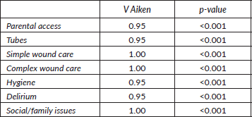 Table 3. Validation of the nursing score content by Aiken's V test.
