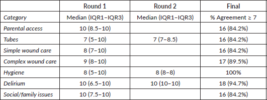 A priori, consensus was defined as at least 80% of participants rating the item with a score of 7 or higher. Categories that failed to reach consensus after four rounds and showed no significant variation across rounds were considered for exclusion from the score.