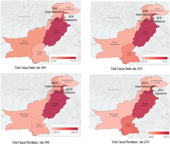 Figure 1. Cancer death and incidence rates in Pakistan's states: 1990 versus 2019 comparison.