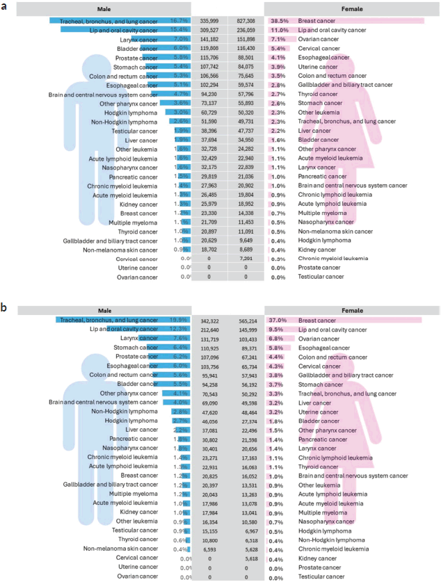 Figure 2 highlights significant gender disparities in the burden of various cancers. Among males, tracheal, bronchus and lung cancer emerge as the leading cause of both new cases and deaths, followed by lip and oral cavity cancer and larynx cancer. In contrast, breast cancer stands out as the predominant cancer afflicting females, in terms of incidence as well as mortality. Lip and oral cavity cancer and ovarian cancer rank second and third, respectively, in terms of incidence as well as mortality.