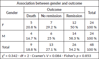 No statistically significant association was found (Fisher’s p = 0.568; Cramer’s V = 0.163).