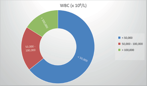 The WBC count at presentation ranged from 1,250 × 10⁹/L to 296,000 × 10⁹/L (median: 29,000 × 10⁹/L; mean: 58,000 × 10⁹/L). For analysis, patients were grouped as follows:
