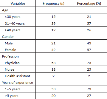 The average age of participants was 32.7 years (±5) and 64% were male. Physicians represented 72% of the sample and 73% had 1–5 years of professional experience. A summary of the sociodemographic characteristics is provided in Table 1.