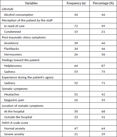 Sadness was reported by 71% of participants, and 87% felt helplessness when caring for end-of-life patients. Trauma-related symptoms included avoidance behaviours (46%), re-experiencing (46%) and nervousness (36%). Somatic symptoms were common: headaches (42%) and epigastric pain (35%), most occurring during work hours (68%). Anxiety assessed via HAM-A showed pathological or abnormal levels in 41%, with 29% severe (Table 2).