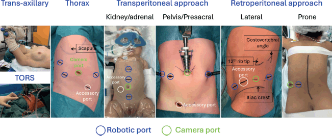 Three factors that may influence morbidity in robotic surgery have been analysed [10]. First, small patients (≤15 kg) have been identified as a potential challenge for robotic-assisted laparoscopic surgery due to limited working space [11]. Second, an American Society of Anesthesiologists (ASA) score of ≥3 is used as a marker of patient vulnerability, as it has been associated with increased perioperative morbidity from both surgical and anaesthetic factors [12, 13]. Third, surgical oncology was examined as a potential contributor to patient morbidity, given the complexity of procedures involving limited tumour exposure, the impact of preoperative chemotherapy on tissue dissection, potential multiorgan involvement, the risk of significant intraoperative bleeding and the oncological risks associated with tumour spillage or insufficient surgical margins [14]. In a recent study, none of these factors were linked to postoperative complications, although major complications (Clavien-Dindo ≥ III) may be more common in patients with a higher ASA score [10]. Figure 1 illustrates the locations of the robotic camera and ports for various tumour anatomies.