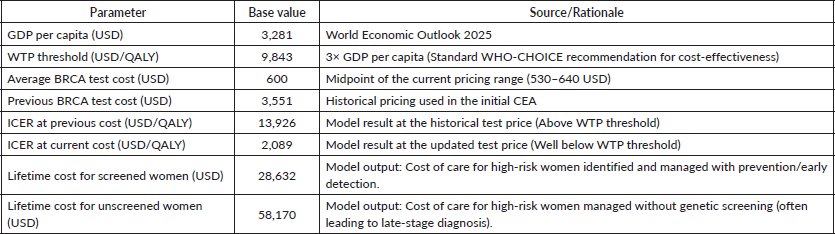 The estimated ICER for breast cancer genetic profiling in Egypt is derived from a key data point: the previous ICER of $13,926 per QALY gained (Figure 2). This figure was based on an earlier, higher testing cost. The dramatic reduction in the cost of genetic testing, by a factor of approximately 85% (from $3,551 to an average of $600), fundamentally alters this calculation. By applying a proportional reduction to the previous ICER, the revised estimated ICER is approximately $2,089 per QALY gained.